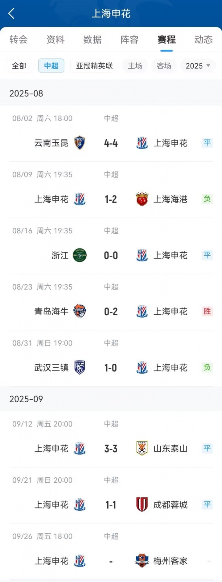 从8月以来,申花7场中超仅有一场胜利(客场2-0海牛),其余6场比赛均不胜,取得4平2负。