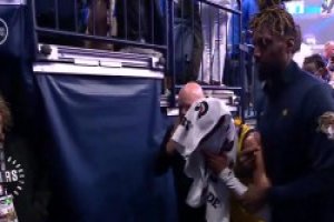 哈利伯顿在队友们的搀扶下离开球场,用毛巾掩面,相当难受啊