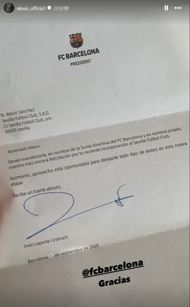 09月23日讯 36岁的智利前锋、巴萨旧将桑切斯今夏回归西甲加盟塞维利亚。今天他更新社媒,展示了一封老东家巴萨发来的贺信。信中大致写道: