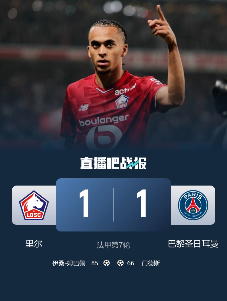 10月6日讯 北京时间2:45,法甲第7轮里尔vs巴黎圣日耳曼。上半场,双方均未获得射门好机会。下半场,努诺-门德斯替补登场贡献任意球世界波!姆巴佩现身看台观战,弟弟伊桑-姆巴佩替补4分钟绝平巴黎!最终,巴黎1-1战平里尔。